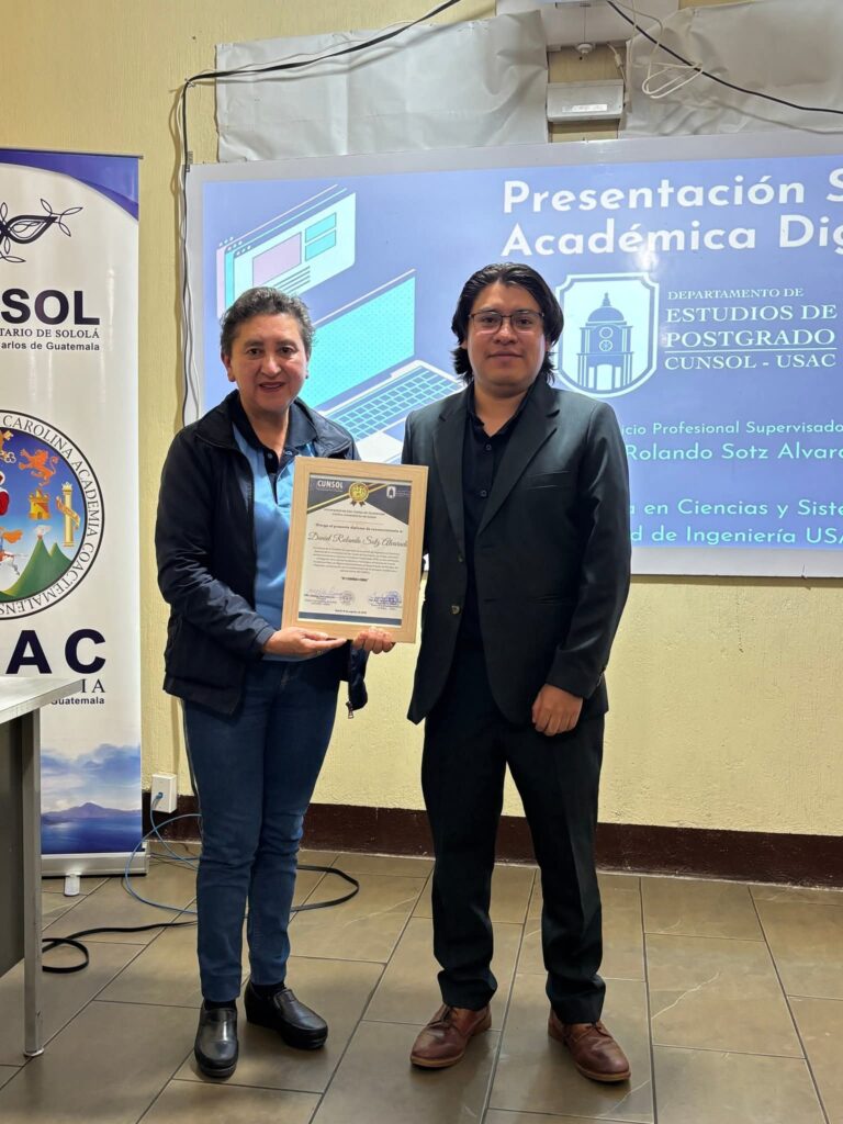 El Departamento de Postgrado del Centro Universitario de Sololá de la Universidad de San Carlos de Guatemala felicita a Daniel Rolando Sotz Alvarado, estudiante de la Facultad de Ingeniería, carrera de Ingeniería en Ciencias y Sistemas de la Universidad de San Carlos de Guatemala, por la presentación de su Ejercicio Profesional Supervisado (EPS) titulado: